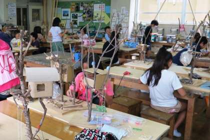 5年生が枝を活用してツリーハウスを作っています。細かなところまで丁寧に仕上げています。