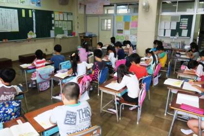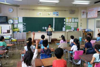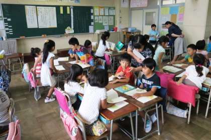 1年生が国語で「ゆうやけ」の学習をしています。今日は、グループごとに音読発表会をしました。一人一人が好きなところを選び、工夫して音読していました。