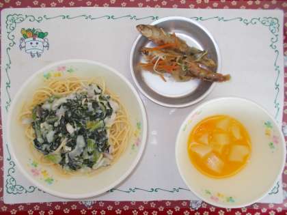 今日の6年生の元気応援メニューは、「ほうれん草のクリームスパゲティー」です。おすすめのポイントは、ビタミンAが多いほうれん草とスパゲッティとの組み合わせで栄養バランスがいいからです。詳しくは、今日の食育メモで紹介しました。