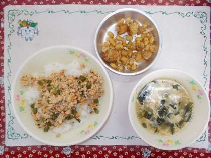 今日の6年生の元気応援メニューは「炒り豆腐」です。おすすめのポイントは、血や肉なる豆腐と肉、体の調子を整える野菜、そしてエネルギのもとになる砂糖や油などが入っていて、栄養バランスがいいところです。詳しくは、食育メモでお知らせします。