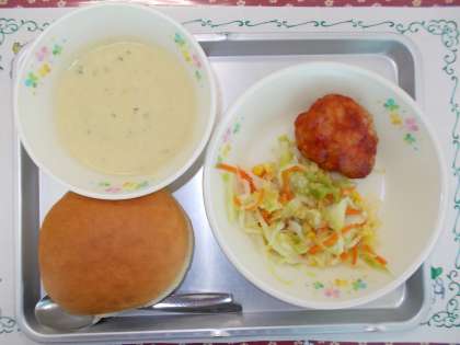 今日の6年生元気応援メニューは、コールスローとコーンポタージュです。コールスローでは、ドレッシングに使われている蜂蜜、コーポタージュでは、パセリの栄養価が高いところがおすすめの理由です。二人ともメイン食材ではない食材の良いところをすすめています。詳しくは、食育メモでお知らせします。