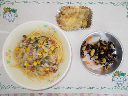 今日は、食物繊維の多いきのこ・ひじき・豆を洋風にアレンジしました。これらの食材は児童に嫌われていますが、きっと今日は食べてくれると思います。