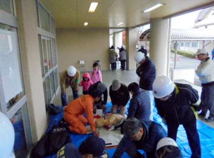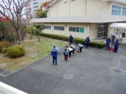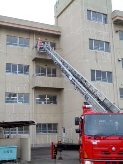 さて、本日は、本校を会場として別所町会の防災訓練が行われました。由木消防署からはしご車も出動してもらい、校舎からの救出訓練も行いました。4回のバルコニーからの救出でしたが、思ったよりも高さを感じ、バケットに移る時は緊張しました。また、AEDと心臓マッサージ、初期消火訓練、119番通報、そして本校に設置されている防災倉庫、濾水装置の見学など、実際の場面に備えて、皆で訓練、確認を行いました。地域のコミュニティの場となるほか、防災の拠点となる学校であると思います。今後とも地域の皆様と学校がコミュニケーションを図っていきたいと思います。本日はありがとうございました。
