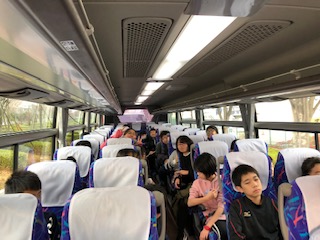 バスで尾根幹線を順調に走っています。バスの中では、普段通り、朝の会が行われています。