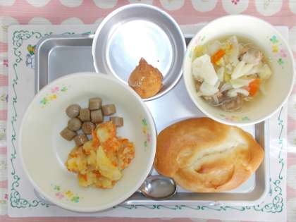 今日は元気応援メニューは「グロンテスープ」です。おすすめのポイントは、ミートボールの他に野菜やキノコが入っていて栄養満点のところです。詳しくは、食育メモでクラスへ配りました。今日は、世界友達プロジェクトでオランダ料理です。