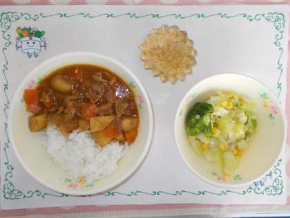 今月から6年生の元気応援メニューは、1組が担当してくれます。今日の元気応援メニューは、「カレーライス」です。おすすめのポイントは、野菜が苦手な人でも野菜を食べられるところです。詳しくは食育メモでクラスへ配りました。