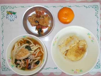 今日の元気応援メニューは、「竹輪とさつま芋の天ぷら」です。おすすめのポイントは、竹輪は魚より食べやすいので魚嫌いの人でも食べられることさつま芋は食物繊維が多く体に優しいところです。詳しくは、食育メモでクラスへ配りました。