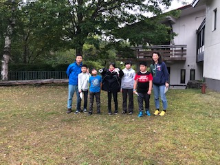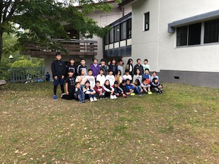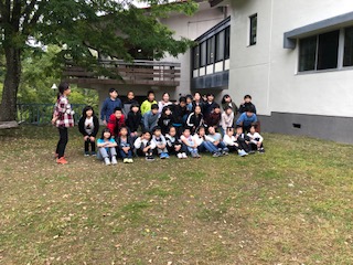 開校式が終わり、宿舎に入る前に、今度はクラスごとに記念撮影しました。撮影が終わったクラスから検温、手指の消毒をして、宿舎に入り、部屋に入って避難訓練をしました。昼食のゴミも出して、少しのんびりです。