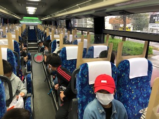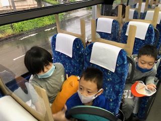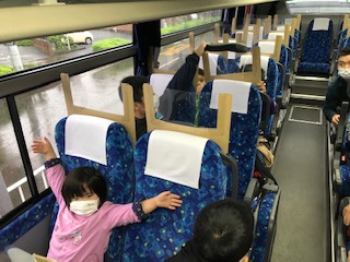 外はかなり強く雨が降っていますが、バスの中は、バスレクで盛り上がっています。係の子どもたちが頑張っています(^。^)