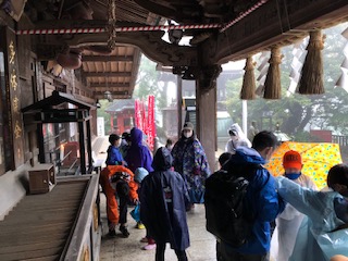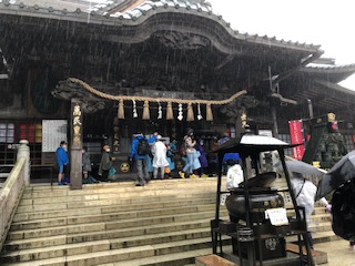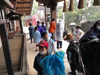 激しく降ってきた雨の中、薬王院に到着しました。途中、傘にあたる雨音で、「焼肉でお肉を焼いているみたいな音がする…」なんて、自然を感じている発言もありました(^。^)