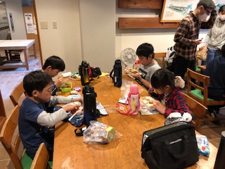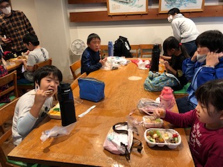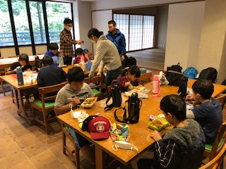昼食の場所は2つに分かれて食べています。こちらのグループも、みんな美味しいと言いながら食べています(^.^)