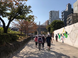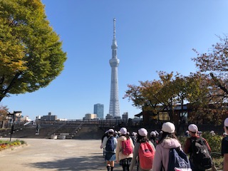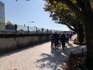 昼食もしっかり食べて、隅田公園を歩いて、水上バス乗り場に向かっています。春の桜の名所ですね…