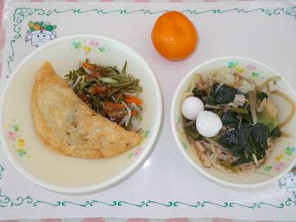八王子ラーメンは、「刻みタマネギ、背脂、醤油味」が特徴です。給食でも本物の味が出せるように、中華麺、だしのきいたスープ、炒めた刻みタマネギ、鶉の卵を給食当番の児童がカップへ配膳します。ちょっと大変だけれど本物に近い味が再現できたらうれしいです。