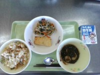 三番叟(さんばんそう)ごはん 鶏肉の桑都(そうと)みそ 定式幕(じょうしきまく)和え ろくろ車すまし汁 牛乳 です。