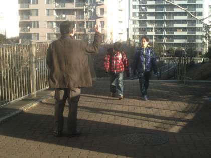 登校時の様子です。兄弟姉妹や近くの子と仲良く登校しています。学期初めで保護教の委員さん方が緑色の上着を着て登校を見守り、あいさつ運動をしています。子ども達もはじめは恥ずかしそうでしたが、だんだん「おはようございます」の声も大きくなって元気にあいさつができるようになってきました。