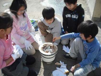 日頃、ガスをひねれば火がつき、蛇口をひねればお湯が出る暮らしをしている子ども達には、マッチで火をつけ炭を燃やすのはかなり難しかったようです。用務主事さんにも参加してもらい、上手に火を起こす様子に驚いていました。