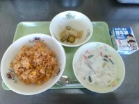 11月12日の給食・キムチチャーハン・ツナポテトぎょうざ・中華風コーンと卵のスー...