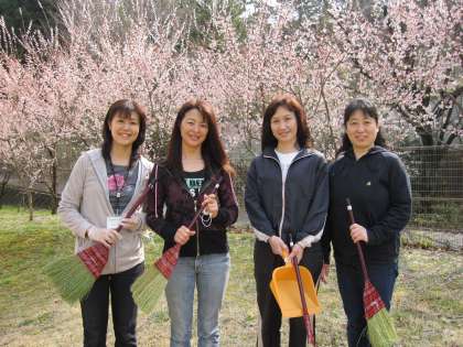 保護者の方も、お忙しい中をお手伝いに来てくださいました。 きれいになった体育館の脇で、こちらもまたきれいに咲き誇る杏の前でパチリ!