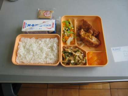 本日の学校給食の献立は「ごはん・ぎょうざの甘酢タレ・中華ボイルサラダ・チンジャオロース・果物・牛乳」です。