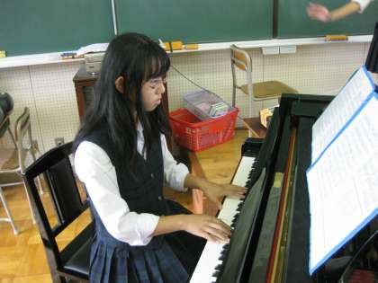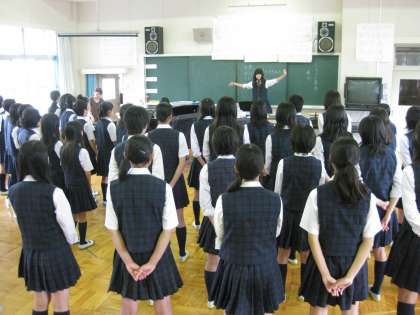1学期の終業式で歌う「校歌」の練習が行われています。