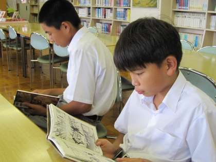 昼休みの図書室です。 数名の生徒が本を読んでいました。( どちらかというと、漫画系が多かったようです ) 今日の 「 ブック・トーク 」 の記事にもありましたが、夏休みにはぜひたくさんの本を読み、読書を通してたくさんの出会いを経験してください。