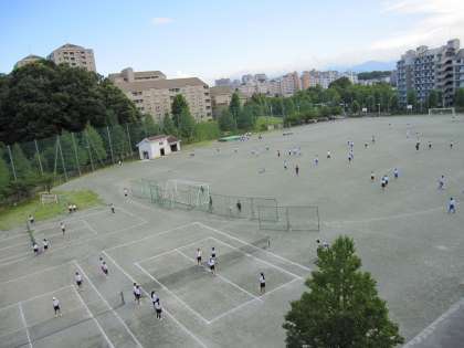 校庭では、テニス部や野球部、サッカー部、陸上部が練習を行っています。