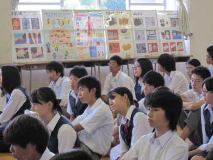 1時間目は、4階のオープンスペースで薬物に関するDVDを視聴したり、薬物の種類や人体に及ぼす害を説明したパネルについて解説を受けたりしました。