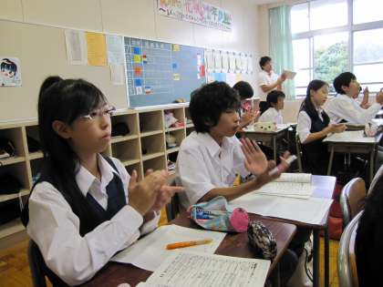 クラスごとに全員が前に出て発表し、発表を聴く人は 「 声の大きさ ・ 内容 ・ 態度 」 などをチェックし、最終的に5段階で評価します。 各クラスで高評価を得た人は、今後学年朝礼や学年集会の場で再度発表してもらうかもしれません。