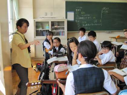 ギターの弦の太さや張り方、はじき方、押さえる場所などによって音の大小 ( 高低 ) が変わる実験を通し、音の性質も確かめました。(写真・上)