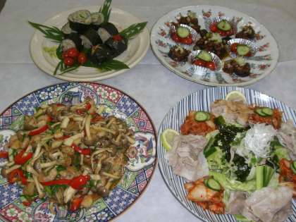 ( 写真・上 ) 左上から時計回りに ● とり釜飯 ● 麻婆茄子 ● キムチ豚しゃぶ ● お焼きそうめんのシーフードあんかけ です。