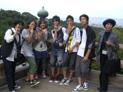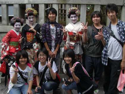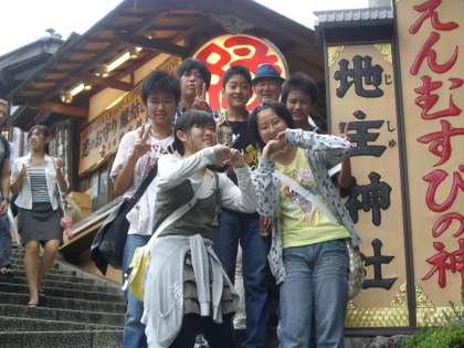 清水坂の中腹にある産寧坂付近で、「なんちゃって舞妓さん」に会いました。 たとえ「なんちゃって」とわかっていても、つい嬉しくなって一緒に写真を撮ってくれるよう頼んでしまいます。 「なんちゃって」さんも、まんざらではないようです。