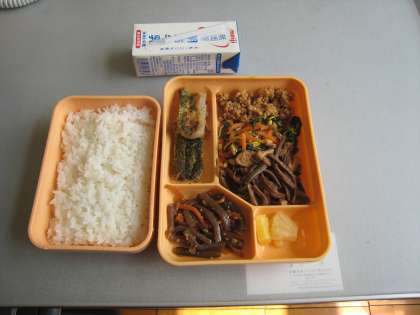 本日の給食の献立は「ご飯・ビビンバ・竹輪のマヨネーズ焼き・こんにゃくのきんぴら・果物・牛乳」です。