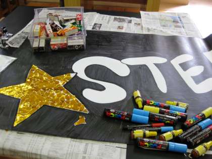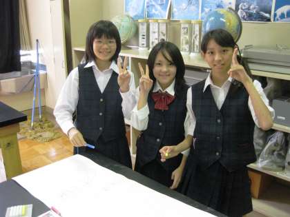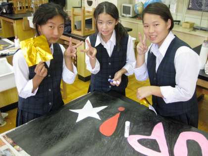 中間考査も終了し今日の放課後は、各委員会の生徒が生徒総会で掲示する「スローガン」を模造紙に描きました。