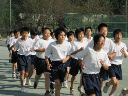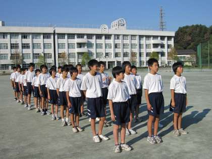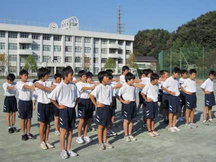 男子は授業の前半、校庭で集団行動の練習をしていました。