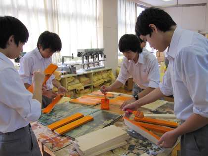 赤・青・黄・茶・橙(だいだい)・白の6色から、同じ色を選んだ者同士、作業台を囲んで刷毛で塗っています。( 写真・中 )
