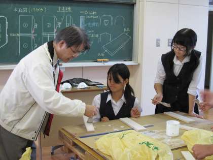 教室の外にいるグループは、塗料を塗りやすくするために木材に紙ヤスリをかけて、表面を滑らかに仕上げています。 中には、彩色するのがもったいないぐらい(?)つるつるに仕上げている人もいました。( 写真・上 )