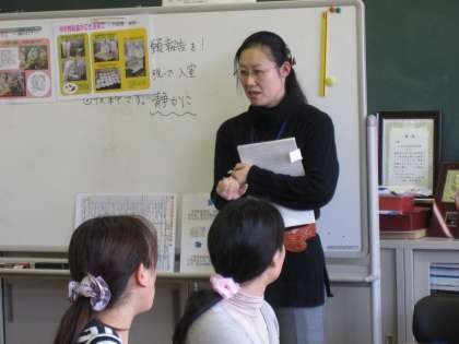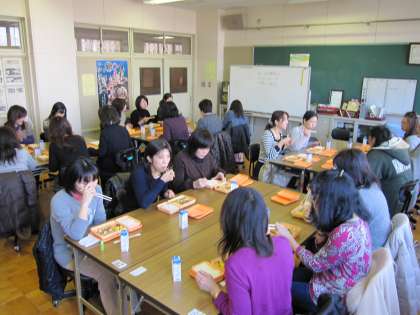 また、市教委の学事課より中学校給食担当の方もおみえになり、給食に対する基本的な考え方や特長等について説明してくださいました。( 写真・中 )