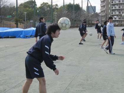 まず、インサイドパス ( 足の内側面で蹴るパス ) やトラップ ( 相手の蹴ったボールを受け止めること )、ヘディングなど、基本的なプレーの練習を行いました。
