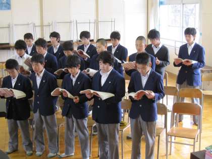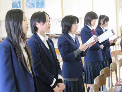 このあと授業では、卒業式で1・2年生の歌う式歌 「 時を越えて 」、全校生徒で歌う式歌 「 この地球のどこかで 」 を練習しました。( 写真・中・下 )
