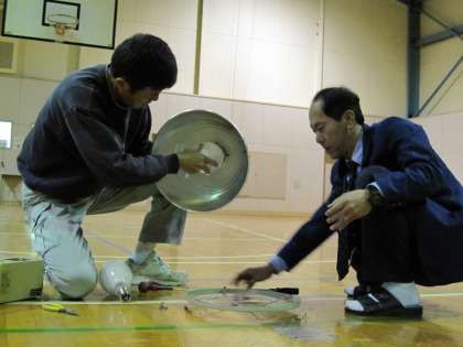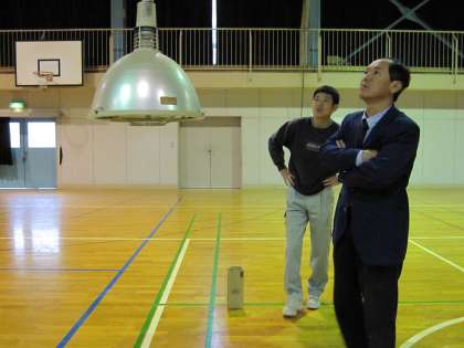 体育館天井のハロゲン灯が切れてしまったため、用務の小山さんと事務の中沢さんが取り替えてくださいました。 この数年間、切れたことがなかったこともあり、私も3年半の間で初めて目にする交換作業です。