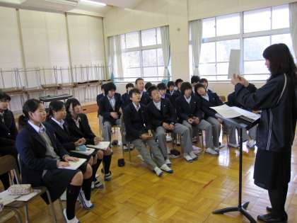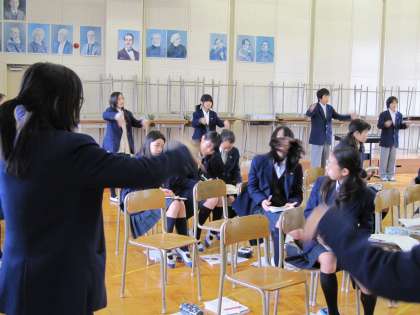 テストのあと、室谷先生から合唱コンクールで指揮者をやるための条件について説明がありました。( 写真・下 )