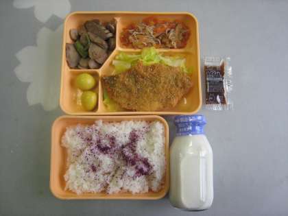 本日の学校給食の献立は「ゆかりごはん・魚のセサミフライ・にんじんじゃこサラダ・ごぼうとウィンナーのソテー・カレー卵・牛乳」です。