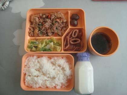 本日の学校給食の献立は「ごはん・スタミナ炒め・キャベツのソテー・いか大根・こんにゃく田楽・わかめスープ・牛乳」です。