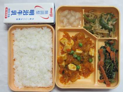 ● ごはん  ● 白インゲン豆の甘煮  ● 豆腐のエビチリソース炒め