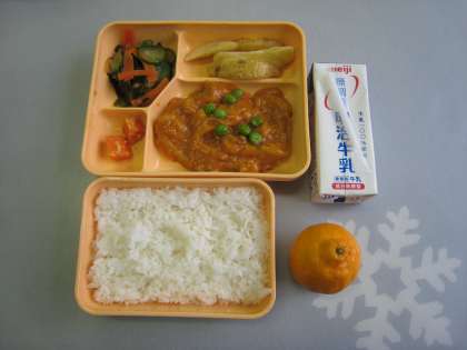 本日の学校給食の献立は「ごはん・ハッシュドポーク・カントリーポテト・海草サラダ・にんじんグラッセ・果物・牛乳」です。