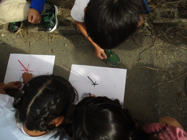 影の動きと太陽との位置関係を学びます。