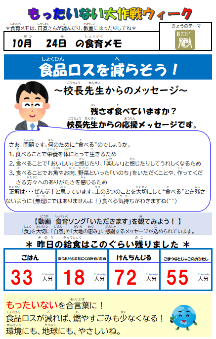 もったいない大作戦4日目、最終日です。みなさん目標に向かって取り組めたでしょうか。