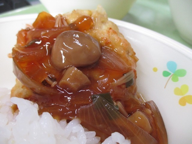 えのきたけ、しめじをたっぷり使ったソースをハンバーグにかけていただきます。