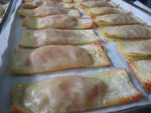 りんごを皮ごと使い、砂糖とよく煮詰め餃子の皮で包んで焼きました。