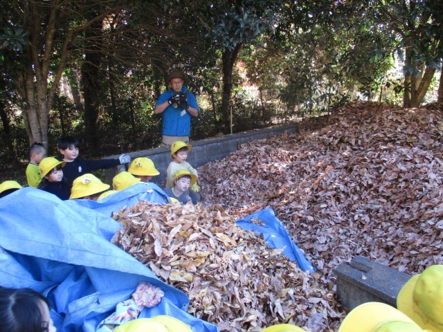 その後、みんなで力を合わせて落ち葉を集めました。集めた落ち葉が2年後に腐葉土となり畑に使われることが分かりました。また、落ち葉を集めることで土に光が届き、その下で暮らす生き物にも良い影響を与えることも分かりました。